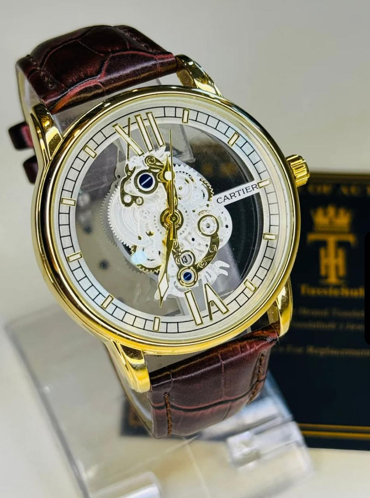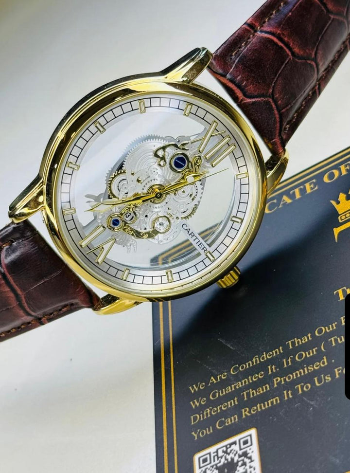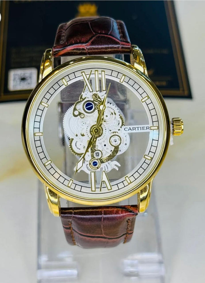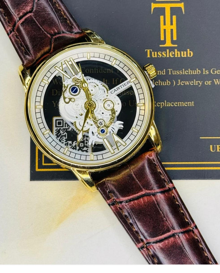 The Cartier Brown Gold Skeleton Leather Watch blends luxury and minimalism with its elegant skeleton dial, brown leather strap, and gold case — perfect for those who appreciate refined craftsmanship with a modern twist.