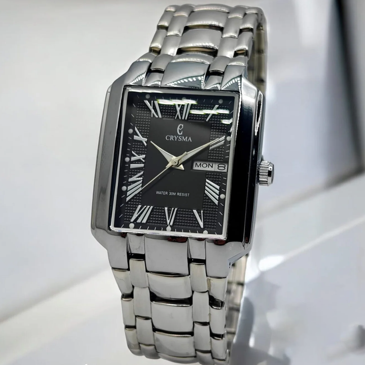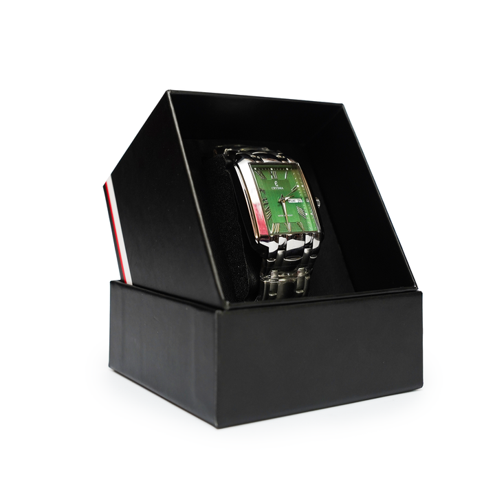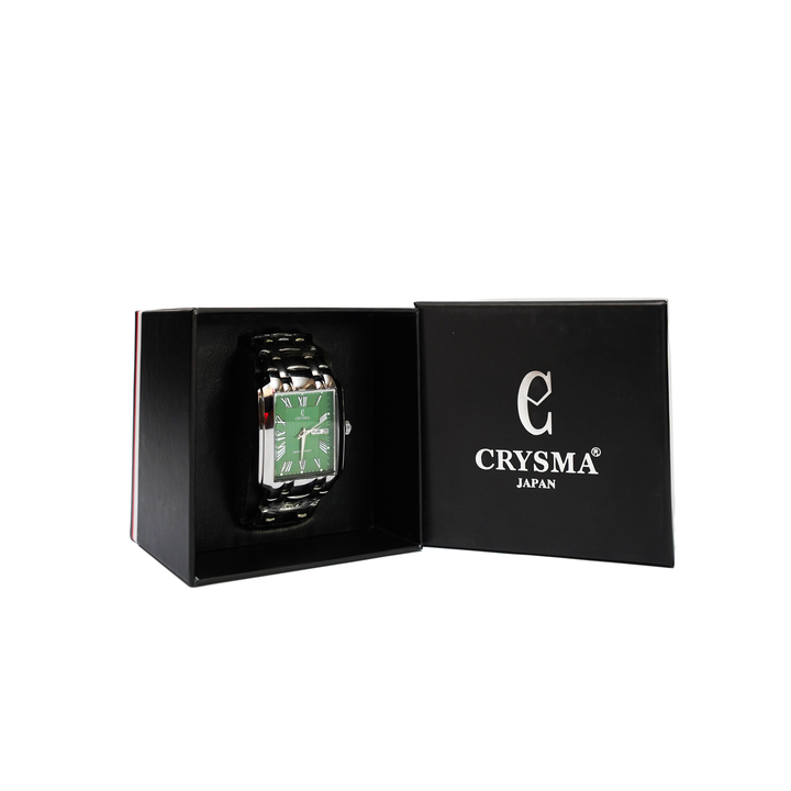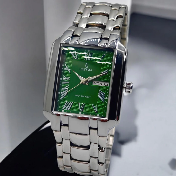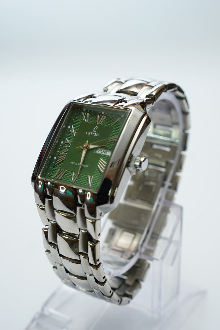 The Crysma CRL1027 Universal Silver/Green blends bold style with reliable performance. Featuring a polished silver stainless steel case, striking green & black interior dial, and practical day & date display, this timepiece is made for men who value style, strength, and everyday accuracy.