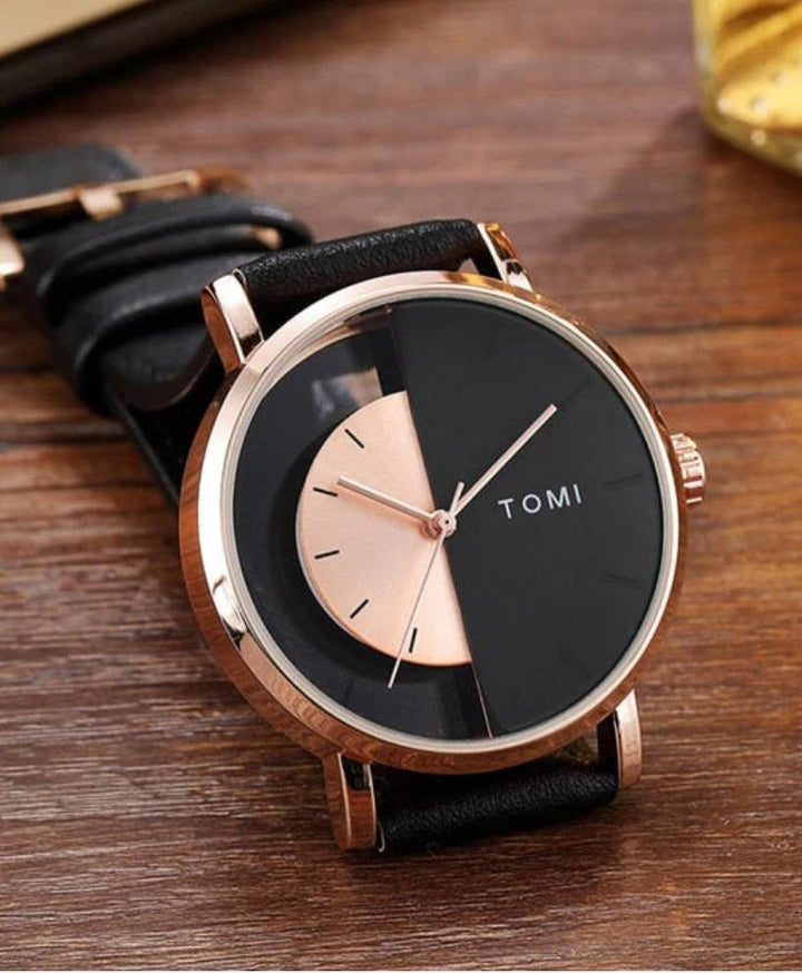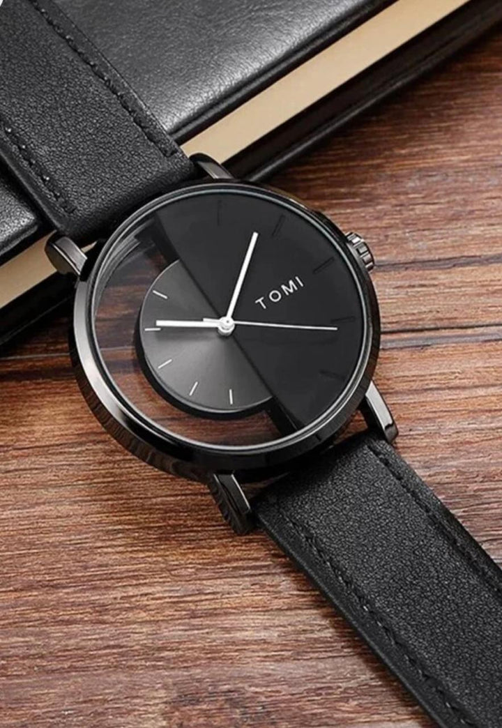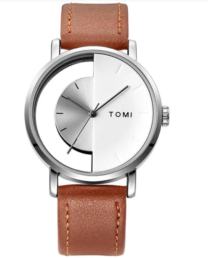 The Tomi Unisex Watch (Model T-080) blends bold design with everyday versatility. Featuring a half-transparent dial and premium leather strap, this watch adds a sleek, fashion-forward touch to any outfit. With its durable build, water resistance, and comfortable hook buckle fit, it’s perfect for both men and women who like to keep their style sharp — whether it’s for a casual day out or a classy evening look.